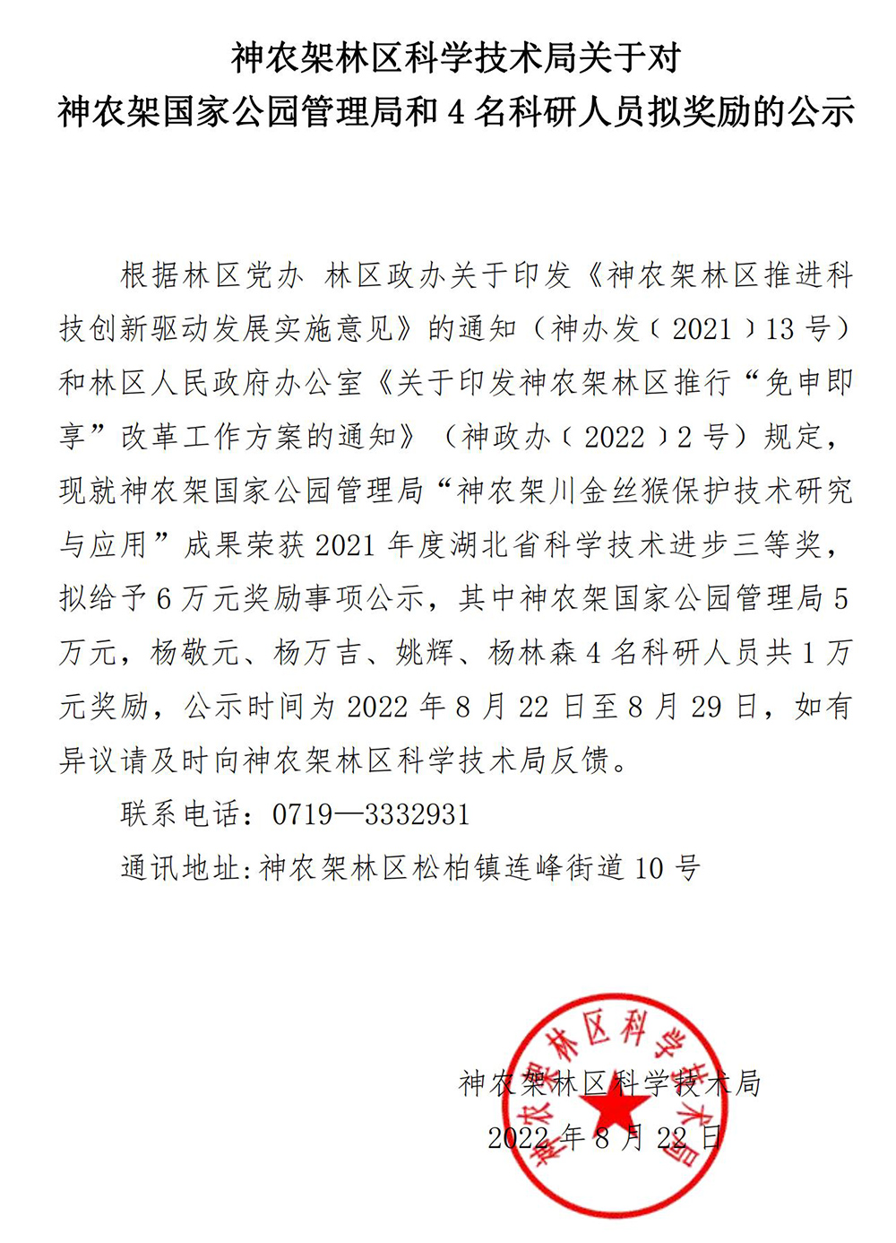 神农架林区科学技术局关于对神农架国家公园管理局和4名科研人员拟奖励的公示