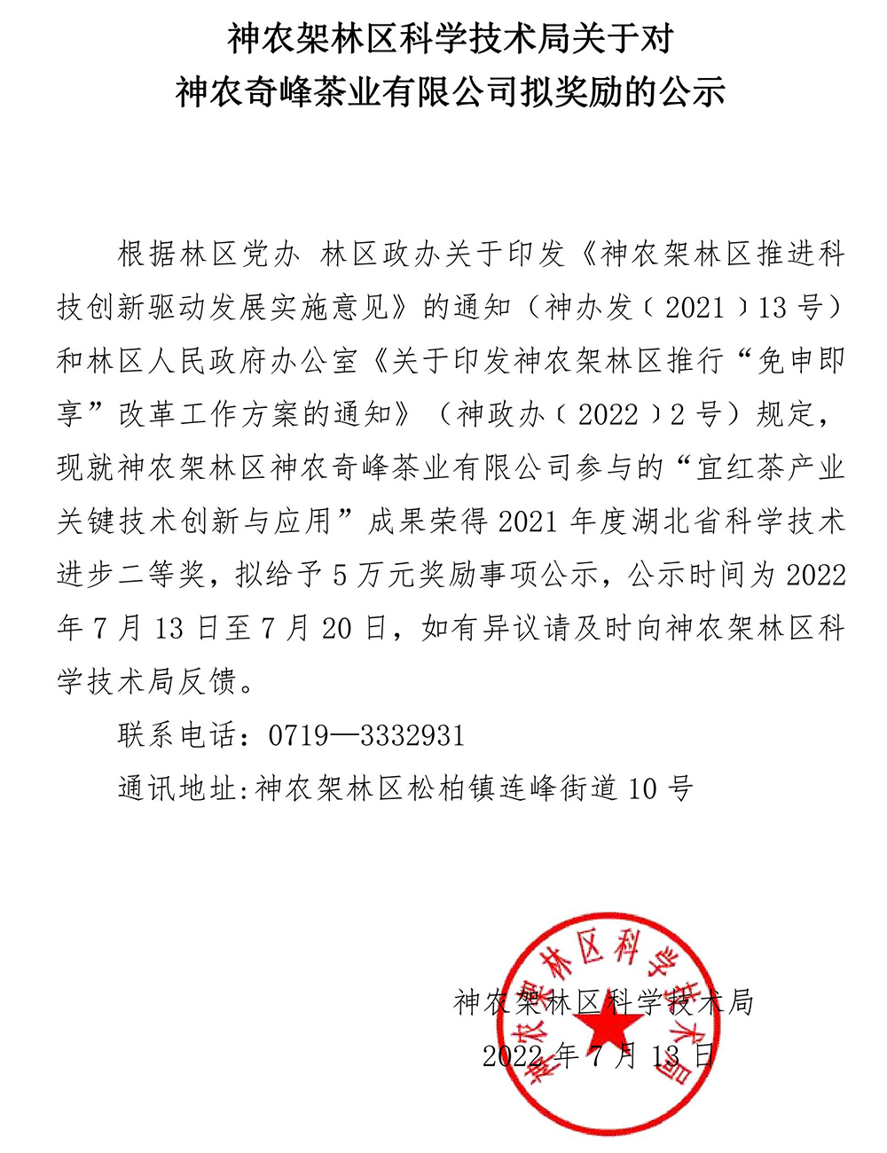 神农架林区科学技术局关于对神农奇峰茶业有限公司拟奖励的公示