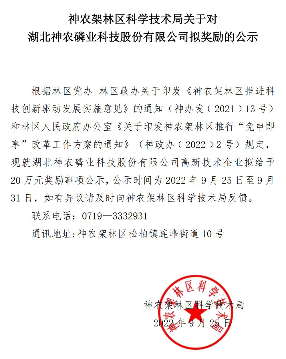 神农架林区科学技术局关于对湖北神农磷业科技股份有限公司拟奖励的公示
